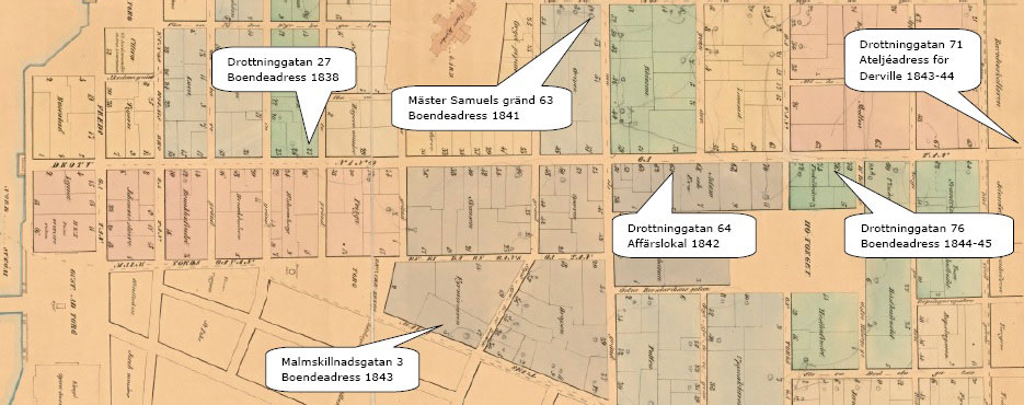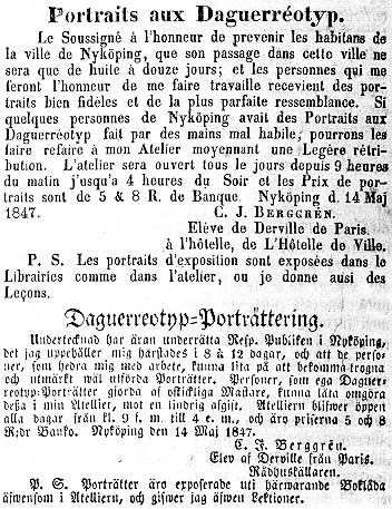 Den franske daguerreotypisten A. Derville kom till Stockholm i november 1843. Han sökte efter en lämplig ateljélokal men hittade ingen så han lät bygga en ateljé vid Bröderna Davidsons norra paviljong, adress Drottninggatan 71. Våren 1844 började Derville ta till sig betalande elever och Carl Johan Berggrén började som lärling. Berggrén som troligen var väl förtrogen med det franska språket bör ha varit en perfekt elev för Derville som då kunde lära ut sina färdigheter på det egna språket och dessutom fick en elev/assistent som kunde fungera som tolk.