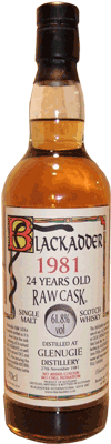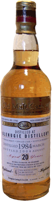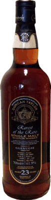Från vänster i bild har vi den buteljering som på allvar triggade mitt intresse för olika tappningar av Glenugie. Det var på Stockholm Beer & Whisky Festival 2003 som jag första gången provade V&S 31-åriga Glenugie i "Part nan angelen" (förkortat PNA)-serien. Det var en närmast religiös upplevelse då Glenugien och mina smaklökar fann varandra i en fullständig symbios. Jag har därefter haft förmånen att prova den vid ytterligare något tillfälle och då förundrats över hur klantig jag var som inte köpte på mig ett litet lager av denna gudadryck innan den tyvärr tog slut. Den håller 43 % och det blev totalt 538 flaskor. Nummer två från vänster är en Signatory bottling ur Vintage serien. Den är 27 år, destillerad 27 april 1976 och tappad på flaska 2 sept 2003 som en av totalt 257 flaskor från fat nr 2700. Den är naturligtvis varken kylfiltrerad eller färgjusterad och håller en fatstyrka på 51,1 %. Whiskyn som lagrats på ekfat hela tiden har en ljus och lätt färgnyans. Michael Jackson* beskriver den generellt som blommig, kådig och i vissa fall medicinal. Han beskriver doften som lätt, med toner av gräs och mandarin medan smakpaletten innehåller kanel, muskot och vaniljstång. Lämplig att avnjuta som en "book-at-bedtime" whisky. Den får 74 poäng av Jackson, vilket jag tycker är en för låg betygsättning. Nummer tre från vänster är en Duncan Taylor ur deras Rarest of the Rare serie. Den är destillerad i nov 1981 och sedan lagrad i totalt 23 år varav de sista åren i en refilled Sherry Butt. Den buteljerades ofiltrerad och icke färgjusterad från fat nr 5155 i juni 2005 vilket gav 516 flaskor med en fatstyrka på 61,9 %. Whiskyn har en underbart djup färgnyans som återspeglar sherryfatets inverkan. Som nummer fyra ser vi en buteljering från Ian MacLeod & Co i deras Chieftain's utgåva. Den är också destillerad i nov 1981, lagrad i 22 år varav de sista i en refilled Sherry Butt och sedan tappad på flaska i aug 2004. Ofiltrerad, ofärgad och med fatstyrka på 52,5 % blev det totalt 654 flaskor från fat nr 5134. Nummer fem är en flaska ur Douglas Laing & Co's serie Old Malt Cask. Det kuriosa med denna tappning är att flaskornas etikett felaktigt anger destillationsår 1984. Därmed har även åldern felaktigt satts till 20 år medan den i verkligheten är 21 år. Destillationen torde ha skett i mars 1983 medan buteljeringen gjordes i aug 2004. Det blev totalt 201 flaskor med en styrka på 50 % från fat nr 1320. Denna tappning är en av mina absoluta favoriter. Då man snurrar whiskyn i provglaset för att studera tårbildningen tror man först att det den helt ska utebli, men så ser man hur det långsamt bildas en vulst runt glasets periferi. Mycket sakta släpper den ifrån sig droppbildningar som utvecklas vidare till tårar som ytterst segt letar sig ner utmed glasets yta. Om tårbildningen verkligen är ett relevant mått på en whiskys fyllighet så förstår ni vart åt det lutar. Med näsan i provglaset överväldigas man av en söt blommig doft men inslag av banan, skumgodis och honung blandat med lätta toner av vanilj och kautschuk. Några droppar vatten i glaset förstärker upplevelsen. Smaken är en upplevelse utan like för de som gillar fruktighet och sötma i kombination med lång eftersmak. Jim Murray** ger den 93 poäng av 100 möjliga och beskriver den med följande ord: "Nose 23p, mango and pawpaw salad. Taste 24p, I'd be tempted to refer you to fruit candy, but I can't think of one that's quite fruity enough to fit the bill. Finish 23p, just wave upon wave of mildly toasty malt, but the sweetness is dept and refreshing. Balance 23p, fruity and fine, the emphasis is very much on the exotic. An expression of one of the rarest malts - one that can never be forgotten.". Jag instämmer! Som sexa i raden återfinner vi en buteljering från Blackadder i serien Raw Cask. Den är destillerad 27 nov 1981 och lagrad på ekfat i 24 år innan den tappades på flaska i juni 2006. Det blev totalt 562 flaskor från fat nr 5515. Fatstyrkan är 61,8 % och den är ofiltrerad, ofärgad och på vanligt Blackadder-manér är det adderat en liten mängd "sediment" från fatet. Färgnyansen är mer åt det mörka hållet än det ljusa trots att den hela tiden lagrats i ekfat. Sist i raden ses en Hart Brothers buteljering i serien Private Collection. Destillerad 1965 och lagrad i 23 år innan den tappades på flaska. Styrkan håller 43 %. Det lär inte bli någon provning av innehållet innan vi fått tag i ytterligare en flaska. * Michael Jackson's complete guide to single malt scotch,